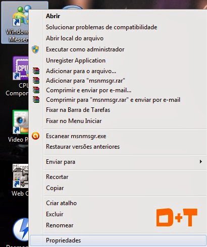 Bom, o truque não exige mistério nenhum, então, clique com o botão direito do mouse em cima do ícone do MSN 2009 e abra a opção "propriedades".