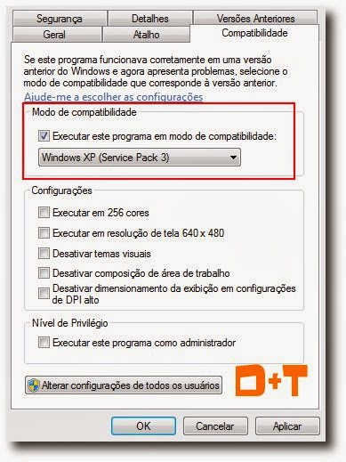 clicar, selecione a aba "Compatibilidade"> marque a caixa "Executar